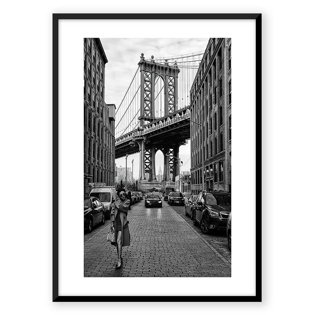 Manhattan Bridge scene in black and white art print.