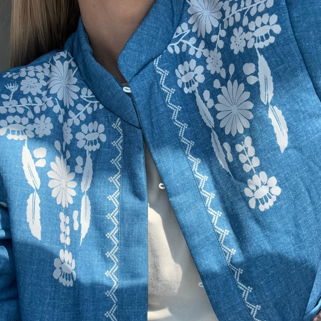 This floral print jacket features delicate small white embroidery on the shoulders, adding a subtle yet sophisticated accent. Its practical design includes two spacious pockets, ideal for keeping your essentials close at hand. Plus, the unique button loops closure offers a modern twist, making it both functional and stylish.
