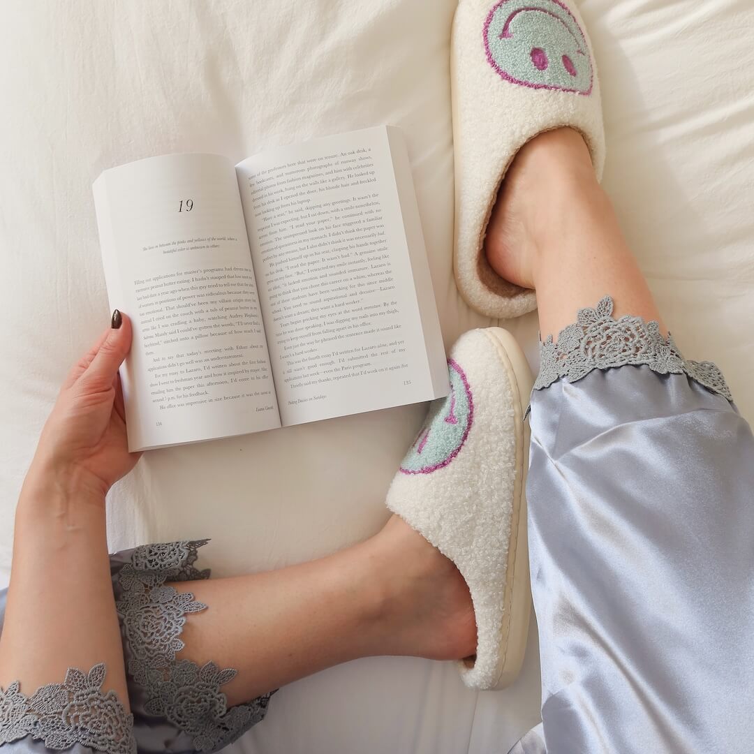 Each of our satin pajama sets comes with five pieces: a camisole, sleep shorts, pajama pants, a satin nightgown, and a robe + a Free Pair of Happy Face Slippers. Lace trim adds a flirty flair to the luminous sheen of satin, and each color choice complements the graceful, stylish design.