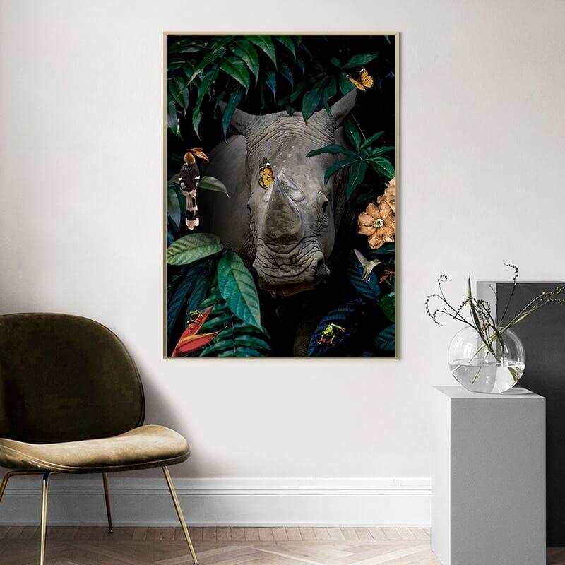 Rhino surrounded by butterflies and jungle foliage (F_13b21628-6a4b)