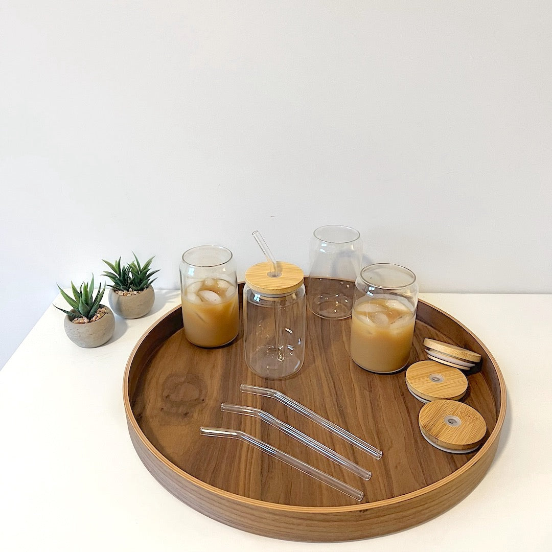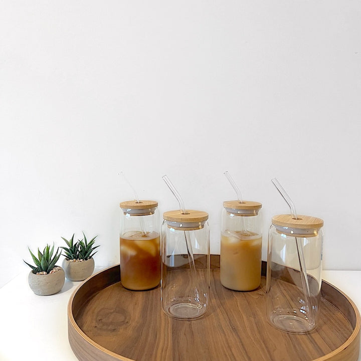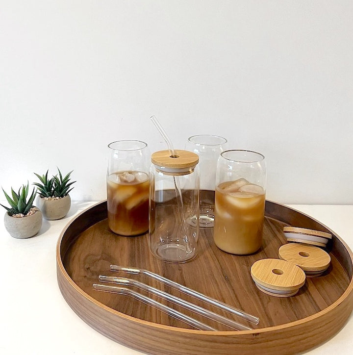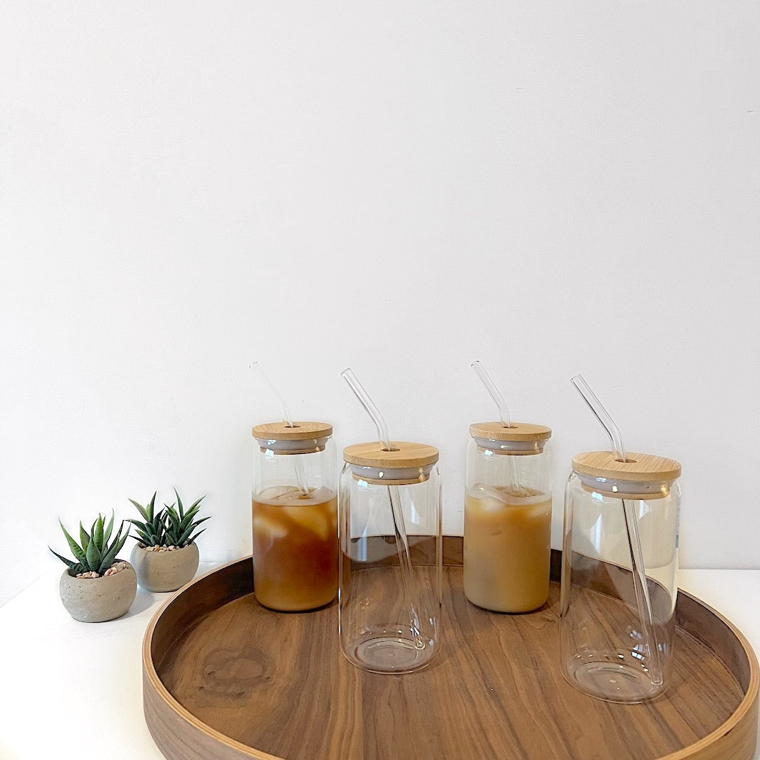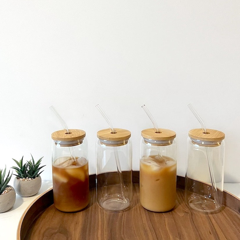 • Includes 4 can-shaped glasses, 4 reusable glass straws, 4 bamboo lids, 1 cleaning brush