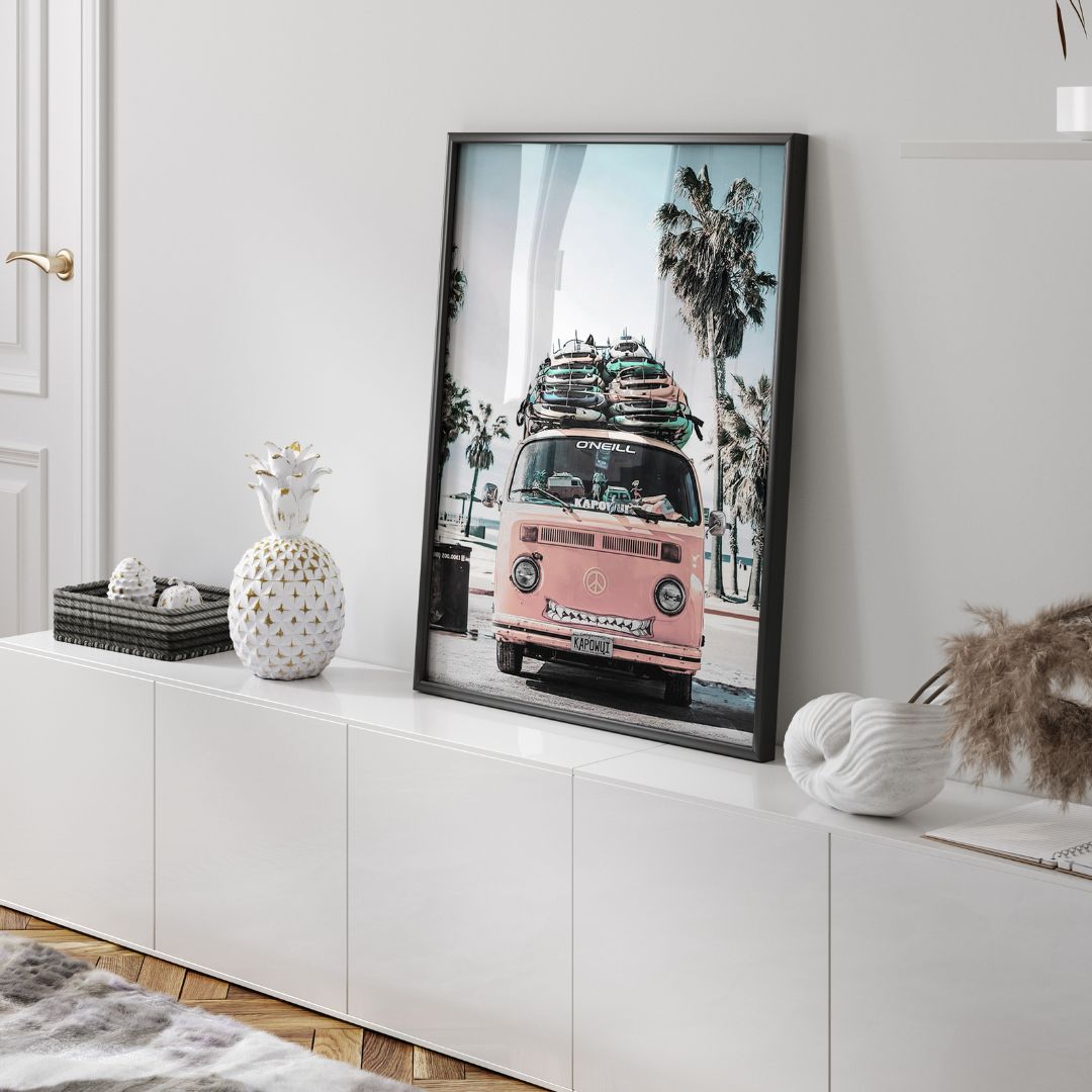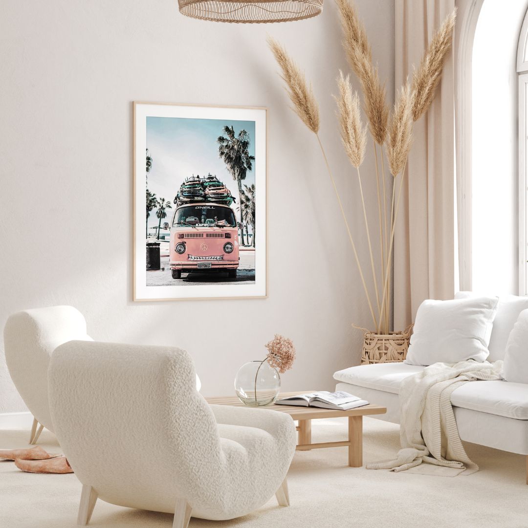 Pink surf van with surfboards, B_730b3611-4a36-482e-b87e-8122096fb0dc