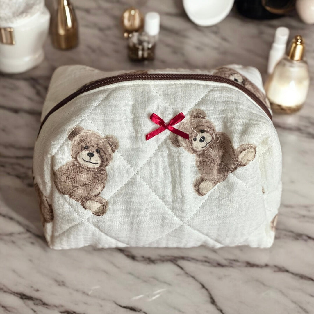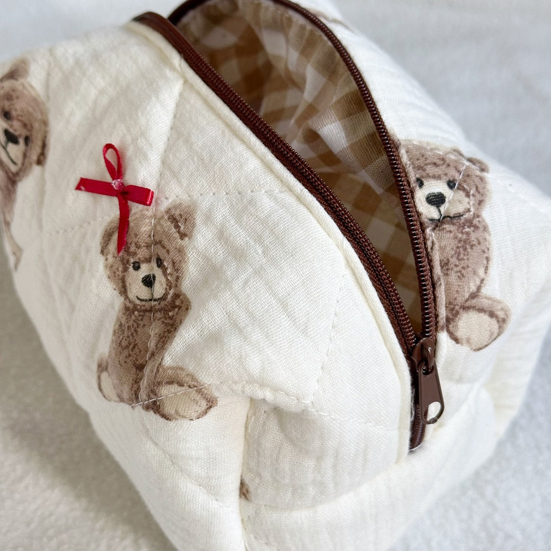 Teddy Bear Bow Quilted Cosmetic Bag