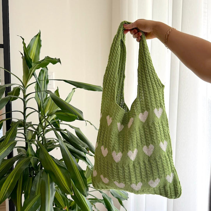 Green knitted tote bag with white hearts.
