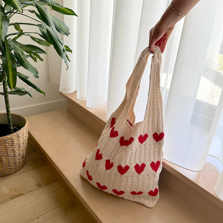 Cream tote bag with red heart pattern held by hand.