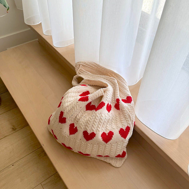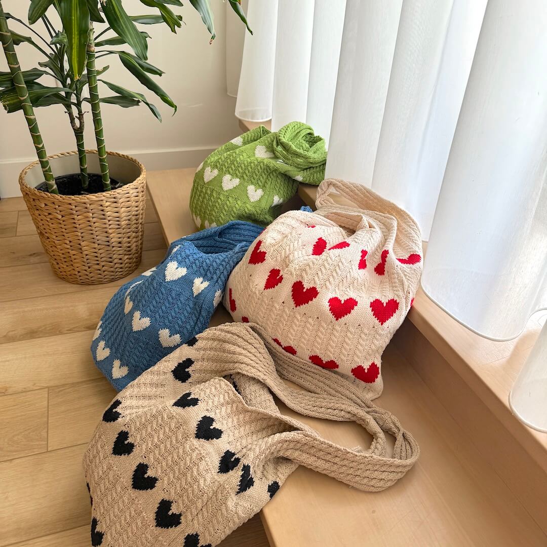 Knitted tote bags with heart patterns.