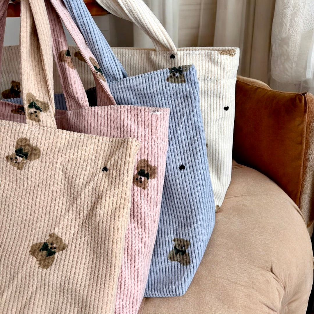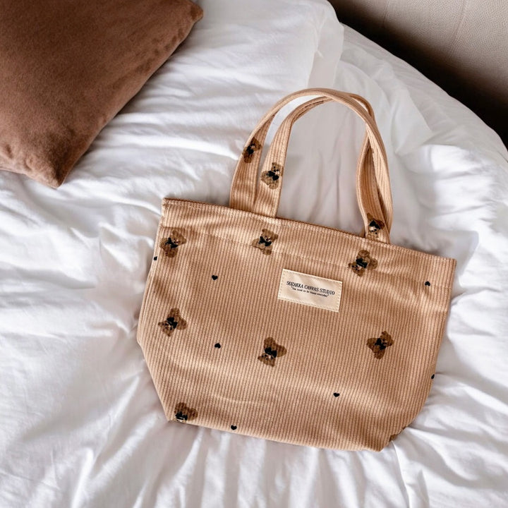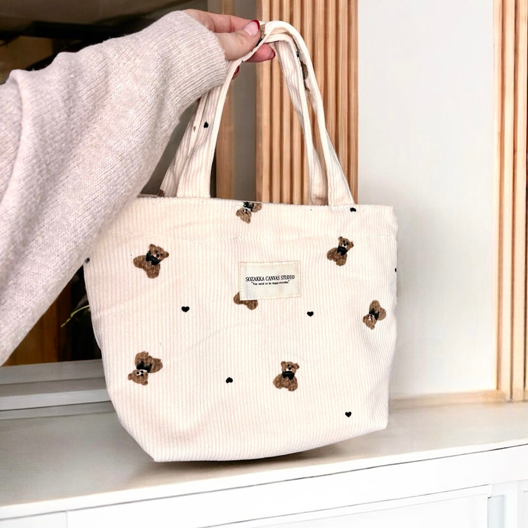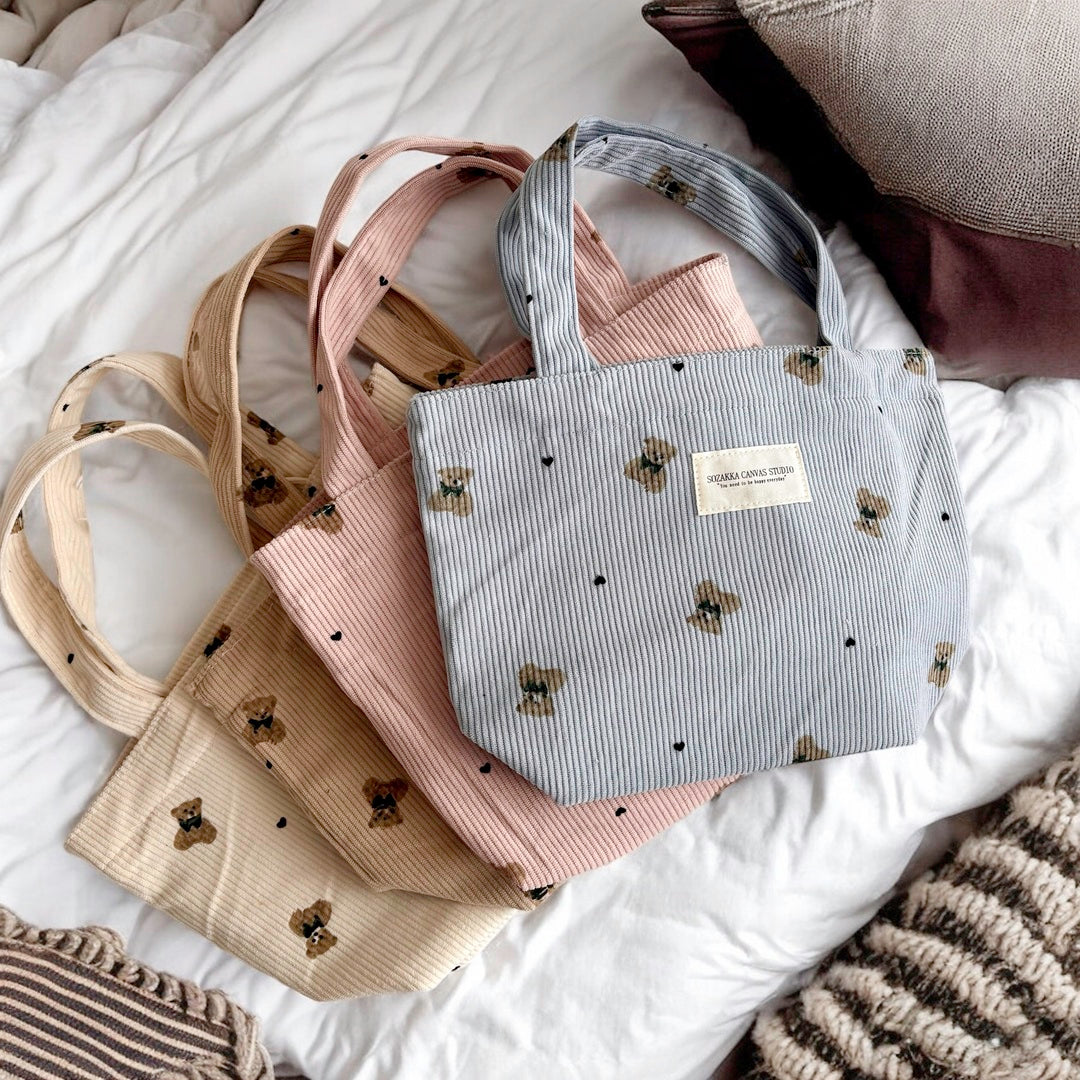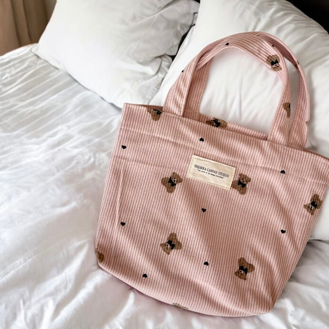 Crafted from durable corduroy with a sturdy polyester lining, the tote bag is designed to keep up with your busy day. Its open-top design makes grabbing your items a breeze, while the charming teddy bear print adds a playful twist. With a roomy interior and handy inside pocket, it’s ideal for work, errands, or casual outings.