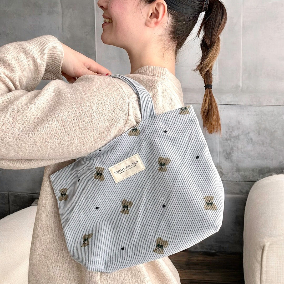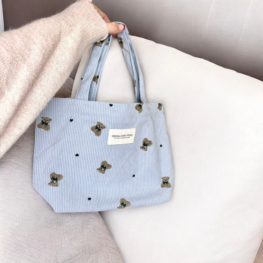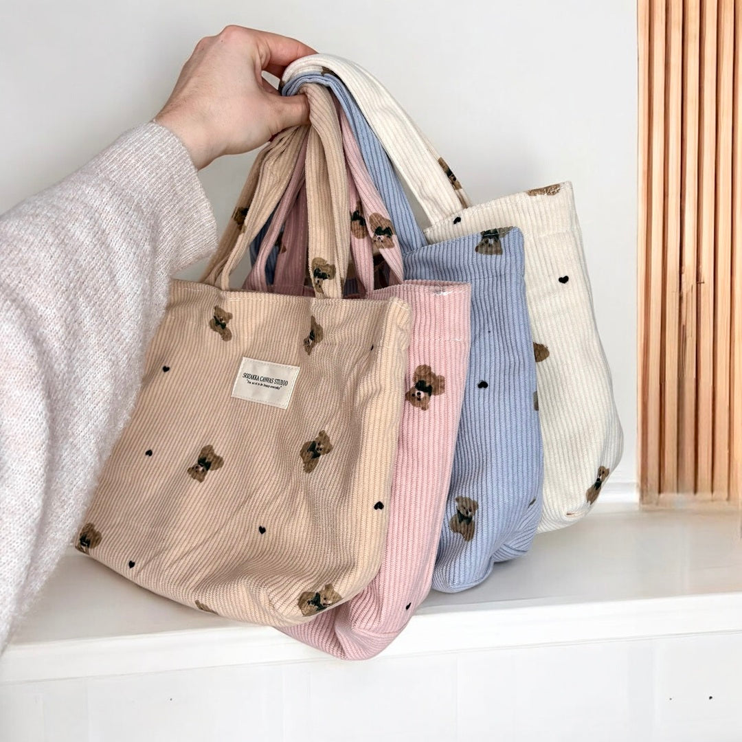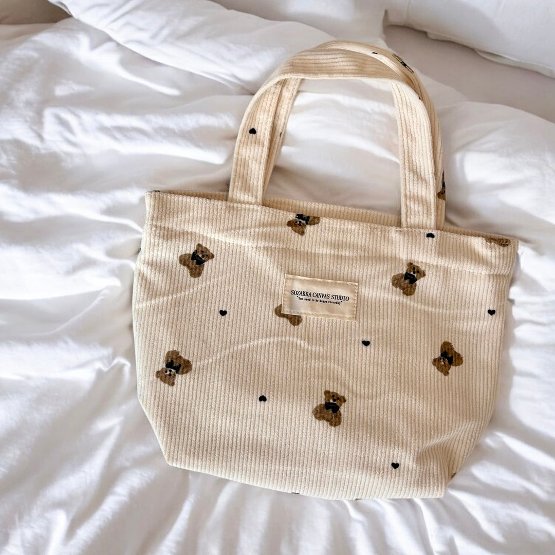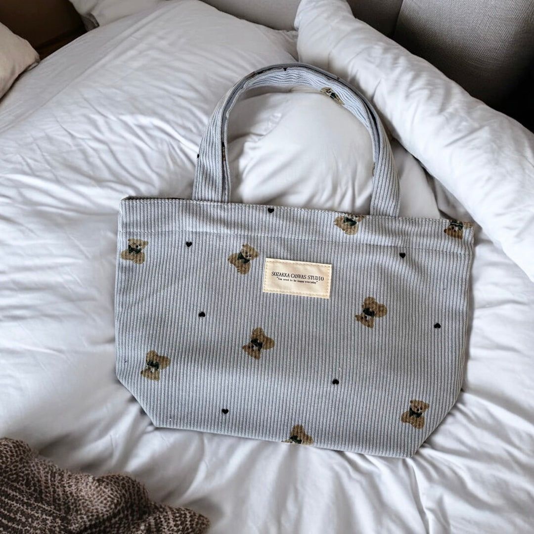Crafted from durable corduroy with a sturdy polyester lining, the tote bag is designed to keep up with your busy day. Its open-top design makes grabbing your items a breeze, while the charming teddy bear print adds a playful twist. With a roomy interior and handy inside pocket, it’s ideal for work, errands, or casual outings.