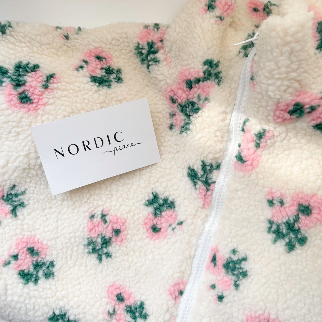 Soft sherpa jacket with full zipper and floral accents